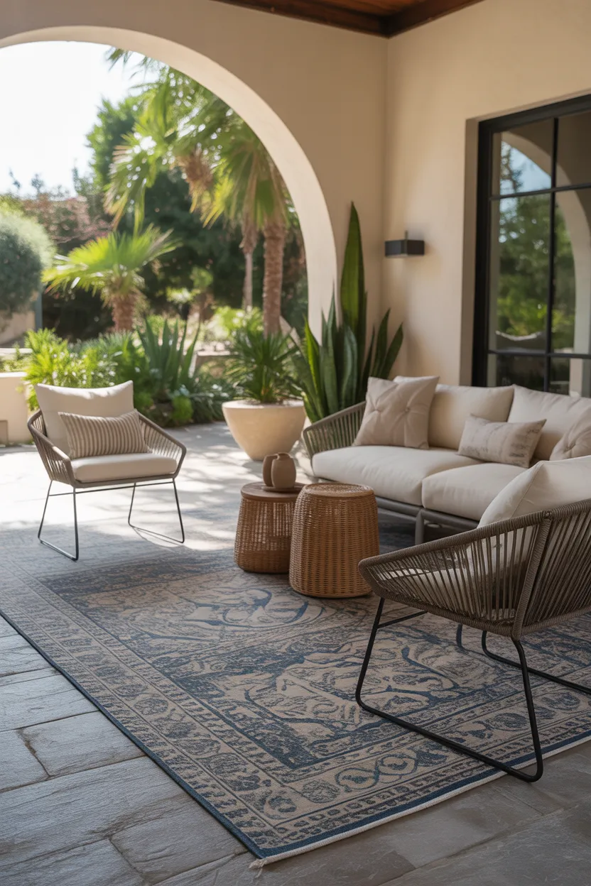 This idea works especially well on patios, decks, and covered lounge zones. It adds warmth underfoot and brings your furniture together visually. That one piece can make the whole space feel more finished.