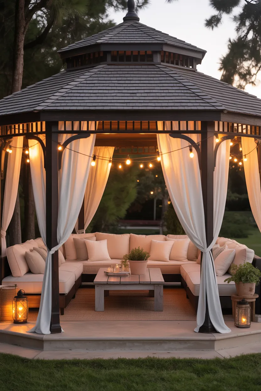Fill the gazebo with outdoor sofas, chairs, layered cushions, and a central coffee table. Add curtains or lights if you want a softer, more inviting feel. I really like this setup because it feels like an outdoor room rather than just a sitting area.