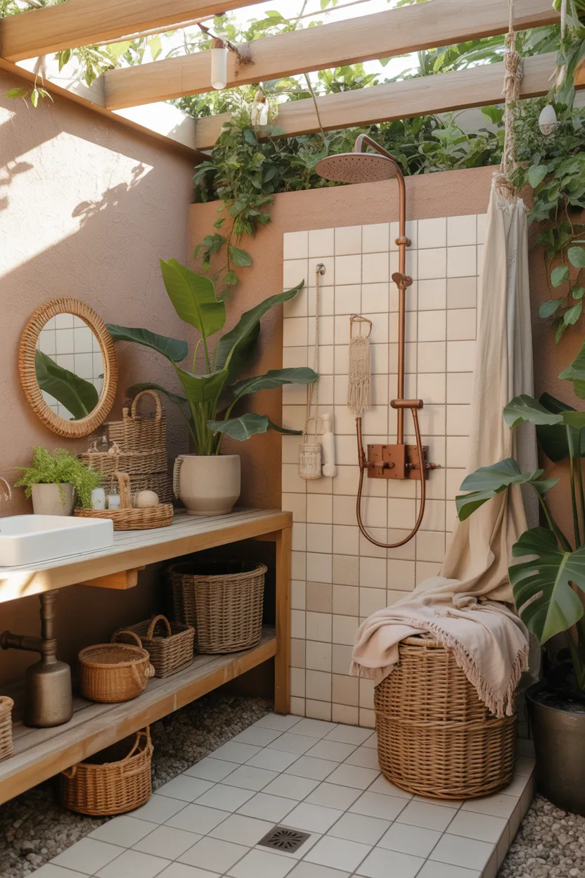 If you like a softer, more layered look, try a boho-inspired outdoor shower. Use natural wood, rattan details, woven baskets, earthy tile, and lots of plants to make the space feel cozy and casual.