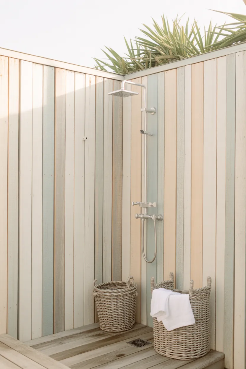 If you love a breezy beach-house look, weathered wood is a great choice. It feels relaxed, sun-washed, and easygoing, which is exactly what a coastal outdoor shower should feel like.