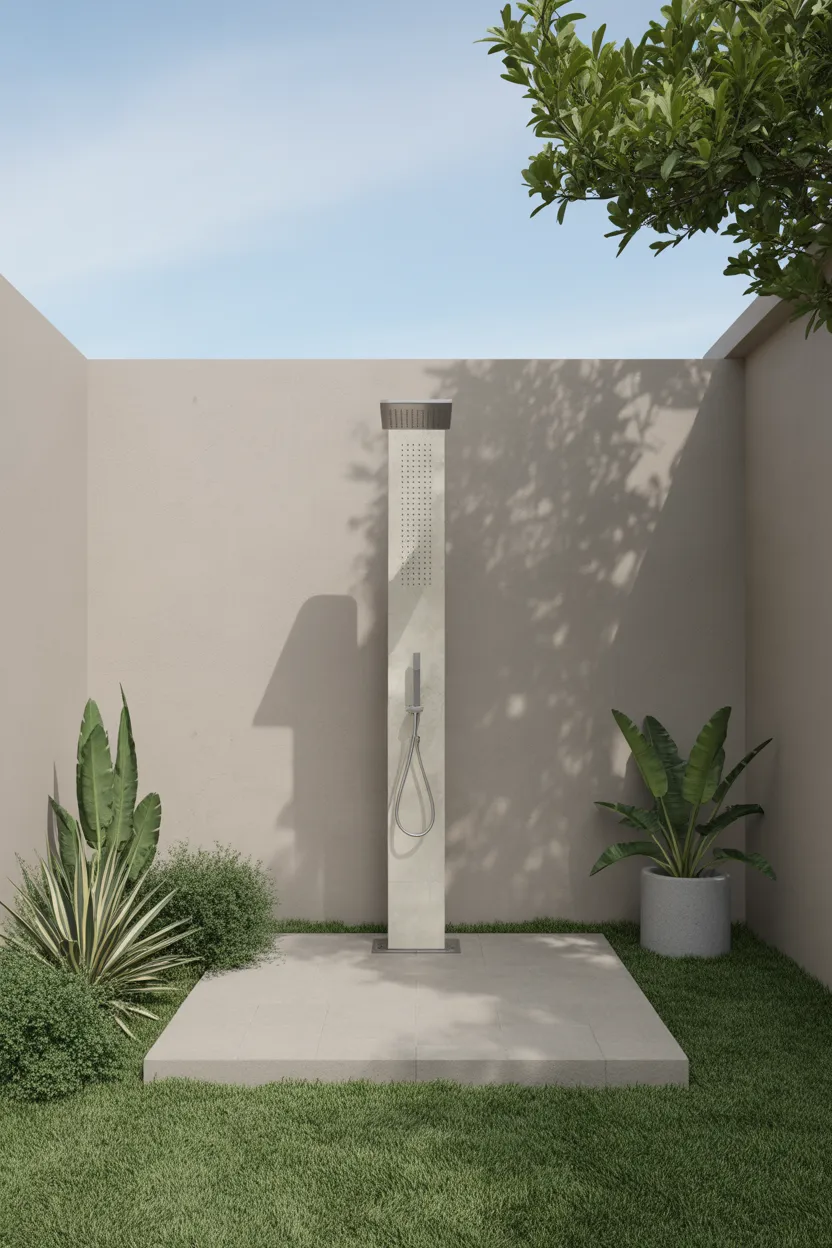 A freestanding outdoor shower column works well if you want a minimal setup that does not need a full enclosure. This style fits modern yards, pool decks, and smaller patios where you want something sleek and simple.