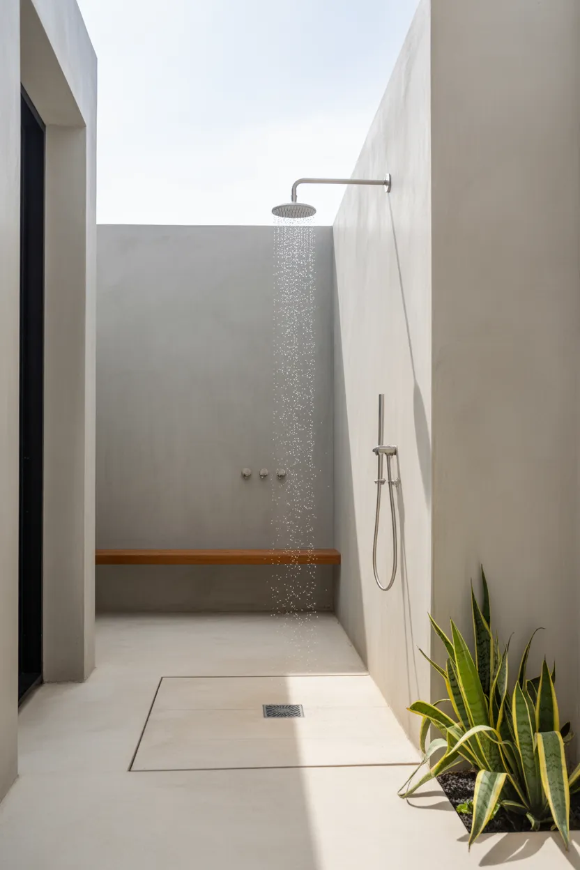 You can use one or two solid walls and leave the top fully open. That balance gives the space structure without making it feel closed off. Modern outdoor shower ideas often lean into this style because it feels architectural and effortless at the same time.
