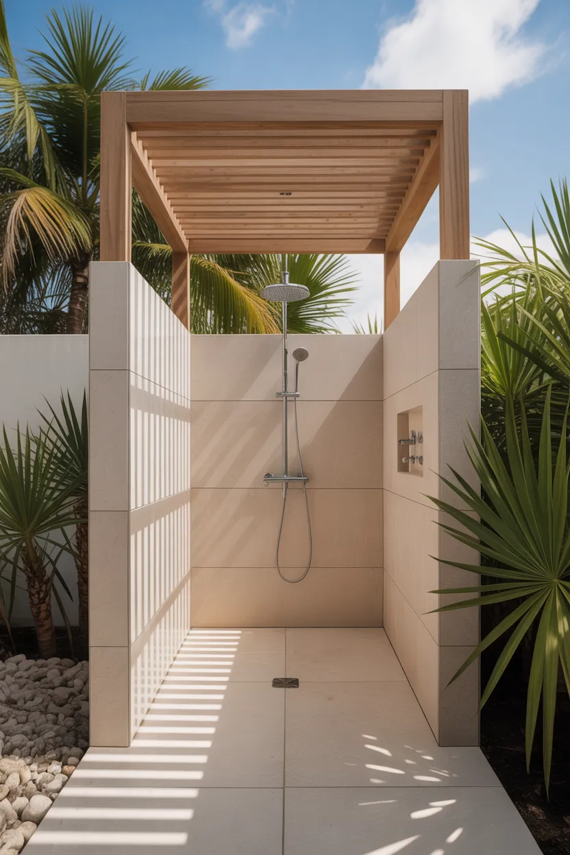 Use bamboo screens or fencing around the shower area to create privacy and texture. Add large tropical plants like banana leaves, birds of paradise, or palms nearby. The result feels lush and soft instead of stiff, which is perfect if you want a more casual outdoor shower setup.