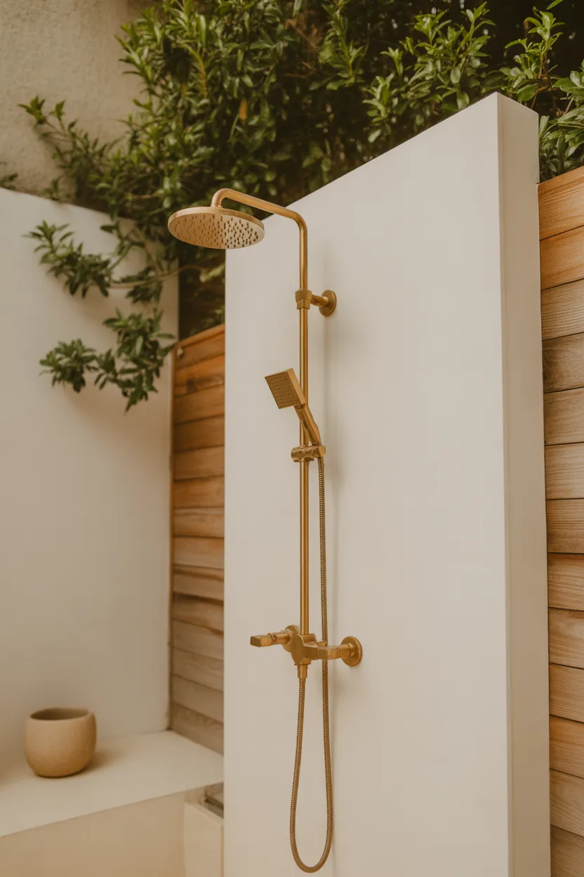 18. Outdoor Shower With Brass Fixtures for Warmth