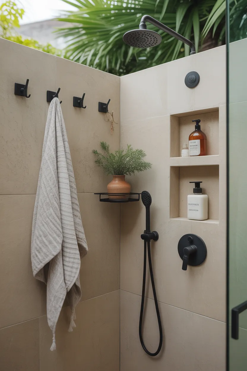 A beautiful shower still needs to work in real life. Hooks for towels, shelves for soap, and a niche for shampoo make the space easier to use and much more enjoyable. Because yes, aesthetics matter, but balancing a towel on a random fence board gets old fast.