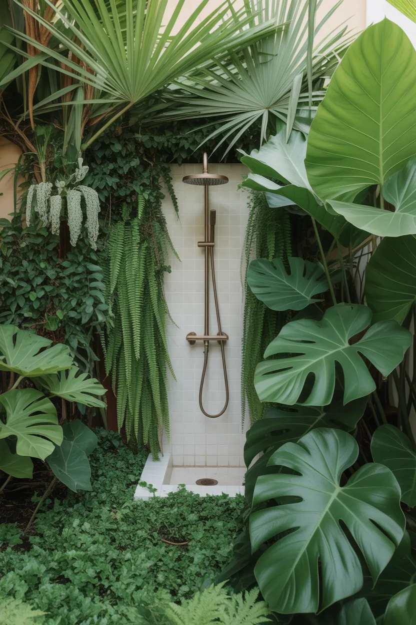 Plants can do a lot of work around an outdoor shower. They soften hard surfaces, create privacy, and make the space feel alive. In my opinion, greenery is one of the easiest ways to make any shower area feel more vacation-like without overspending.