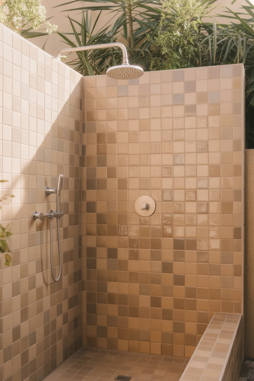 You do not have to tile the entire enclosure either. Even one tiled accent wall or small niche can create a beautiful focal point. I love this option because it brings in personality while still keeping the outdoor shower functional and durable.