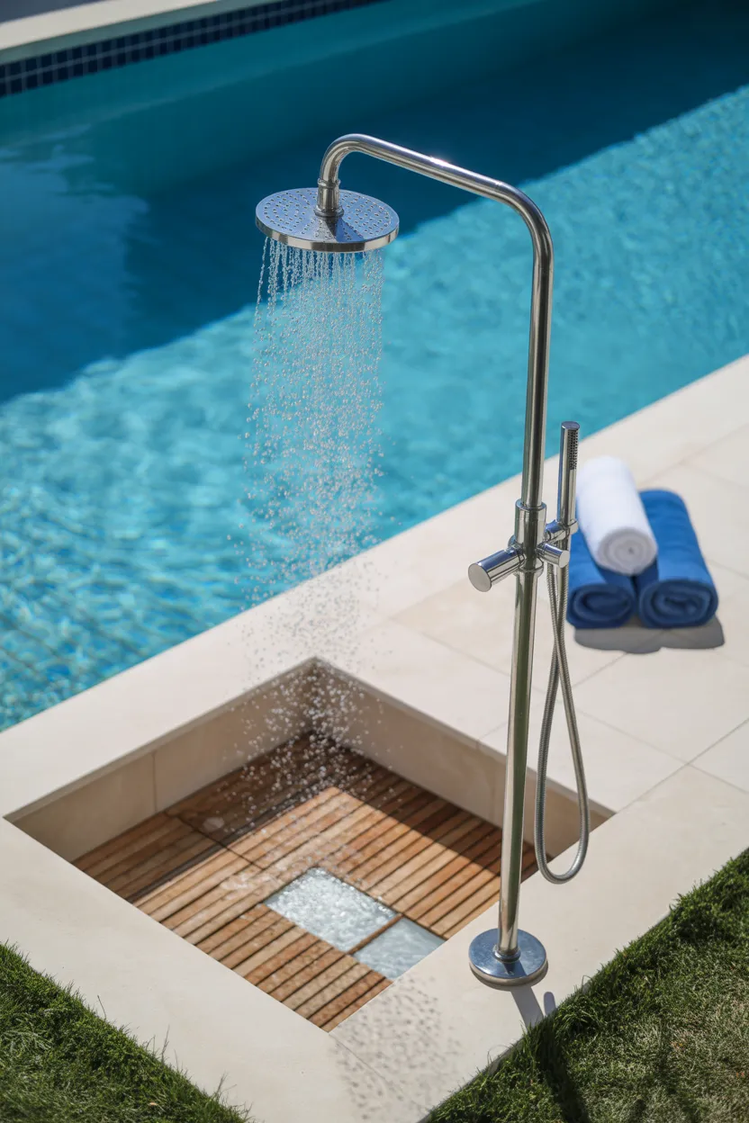 A poolside shower is one of the most practical outdoor shower ideas you can add. It gives swimmers a place to rinse before and after the pool, and it keeps water, grass, and random backyard mess from getting dragged indoors.