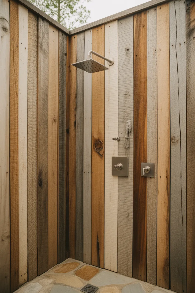 Reclaimed wood gives an outdoor shower a lot of character fast. It feels worn in, natural, and full of texture, which works beautifully in cottage, farmhouse, and rustic-style backyards.