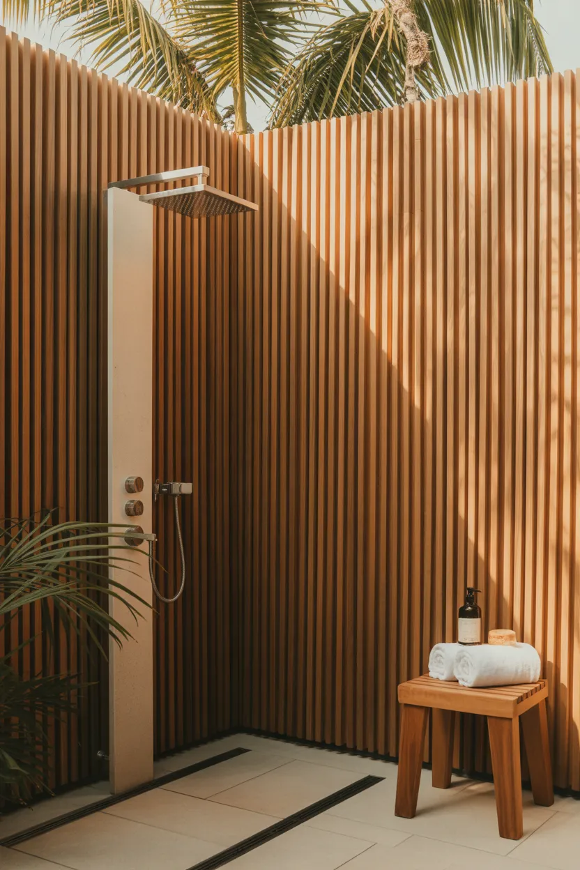A slatted wood enclosure gives an outdoor shower that classic vacation-house feel. It looks relaxed, polished, and expensive without trying too hard. I love this style because the wood softens everything and makes the space feel calm right away.