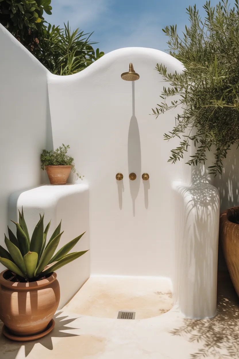 A white stucco outdoor shower feels bright, fresh, and timeless. It works especially well if you love Mediterranean, coastal, or Spanish-inspired design. The crisp finish reflects light beautifully and helps the area feel open and airy.