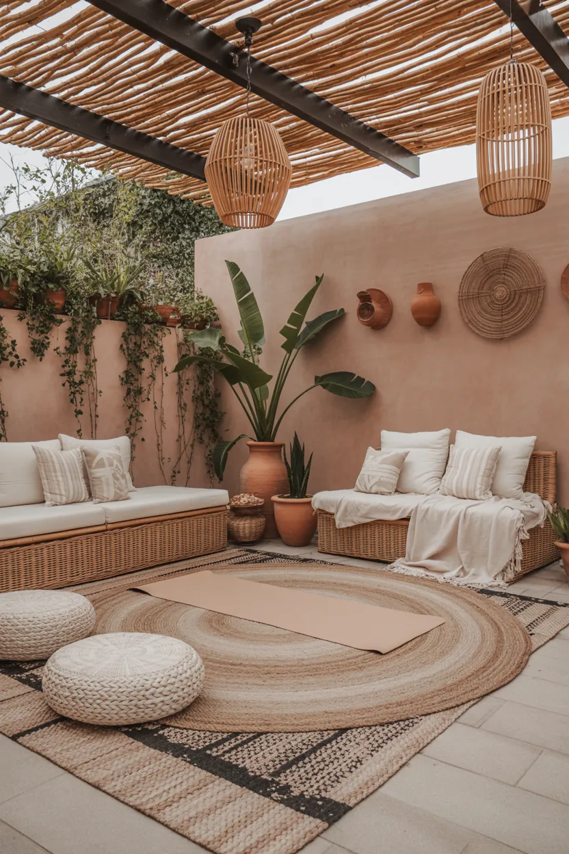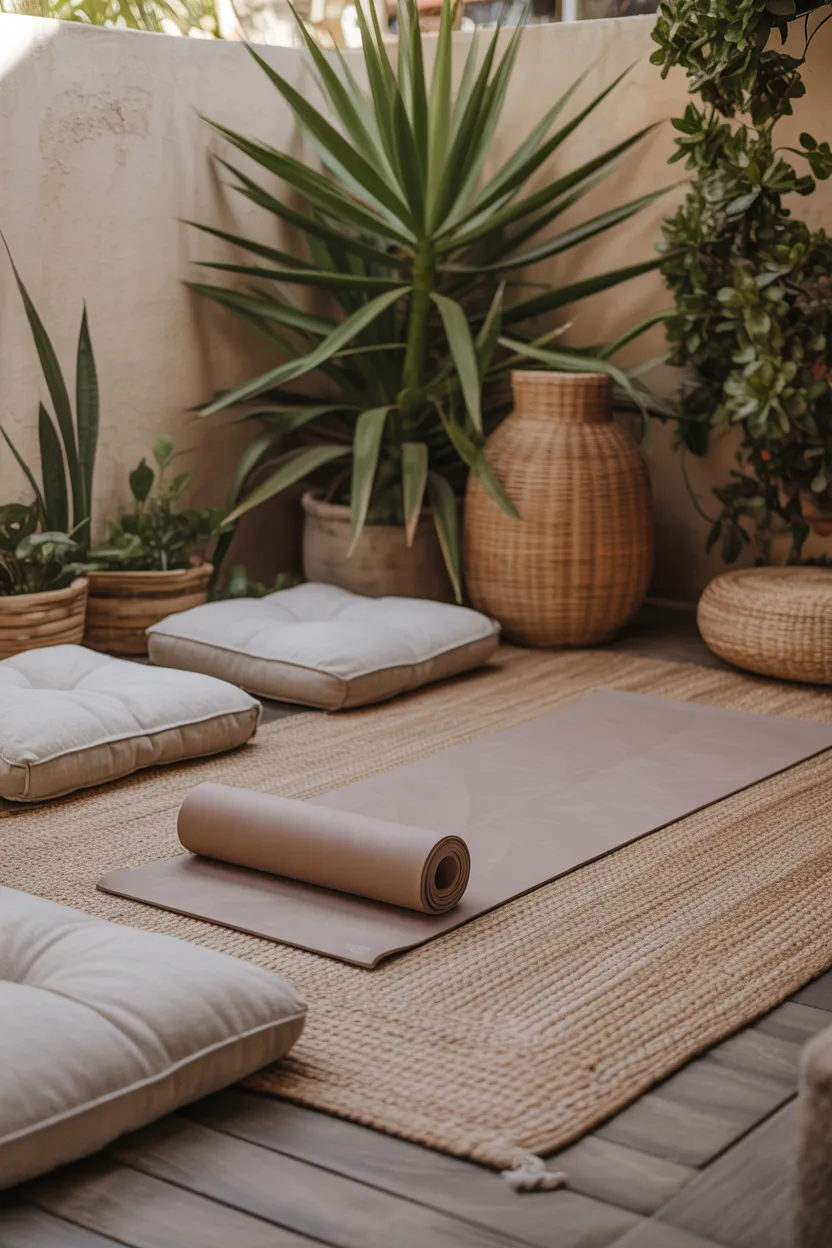 If you like spaces that feel cozy, warm, and a little dreamy, a boho-style yoga patio can look beautiful. This idea works best when you mix texture, natural materials, and relaxed colors without cramming the area full of random “aesthetic” stuff.