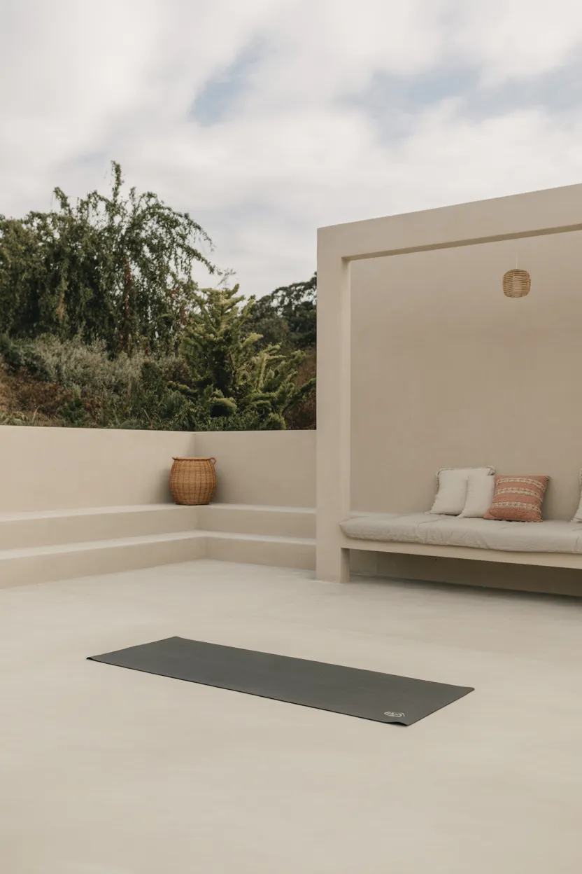 A small seat can make an outdoor yoga space much more useful. It gives you a place to pause before or after practice, set down your water bottle, or sit for breathwork and meditation.