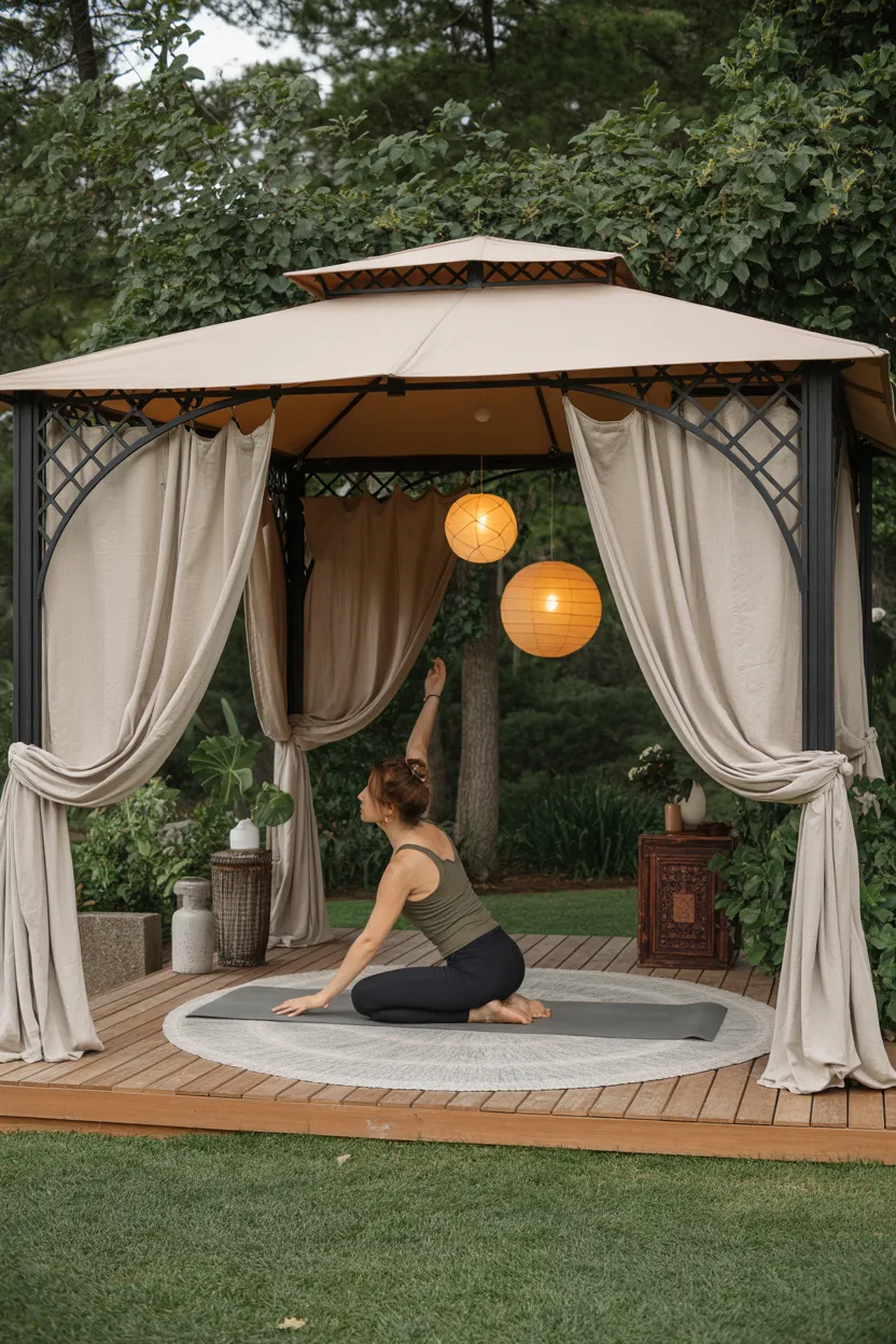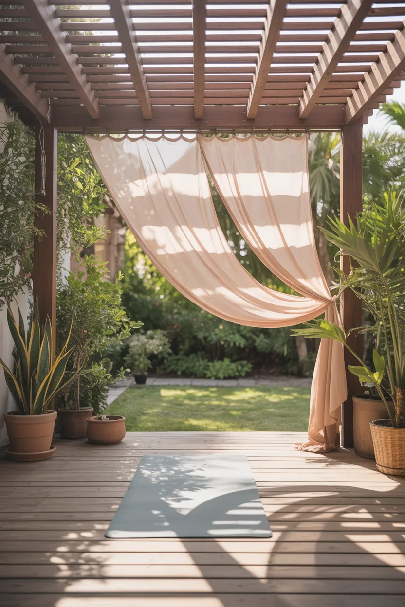 Outdoor curtains make a yoga setup feel softer and more private. If your space sits under a pergola, gazebo, covered patio, or even a basic frame structure, curtains can instantly shift the mood from plain to peaceful.