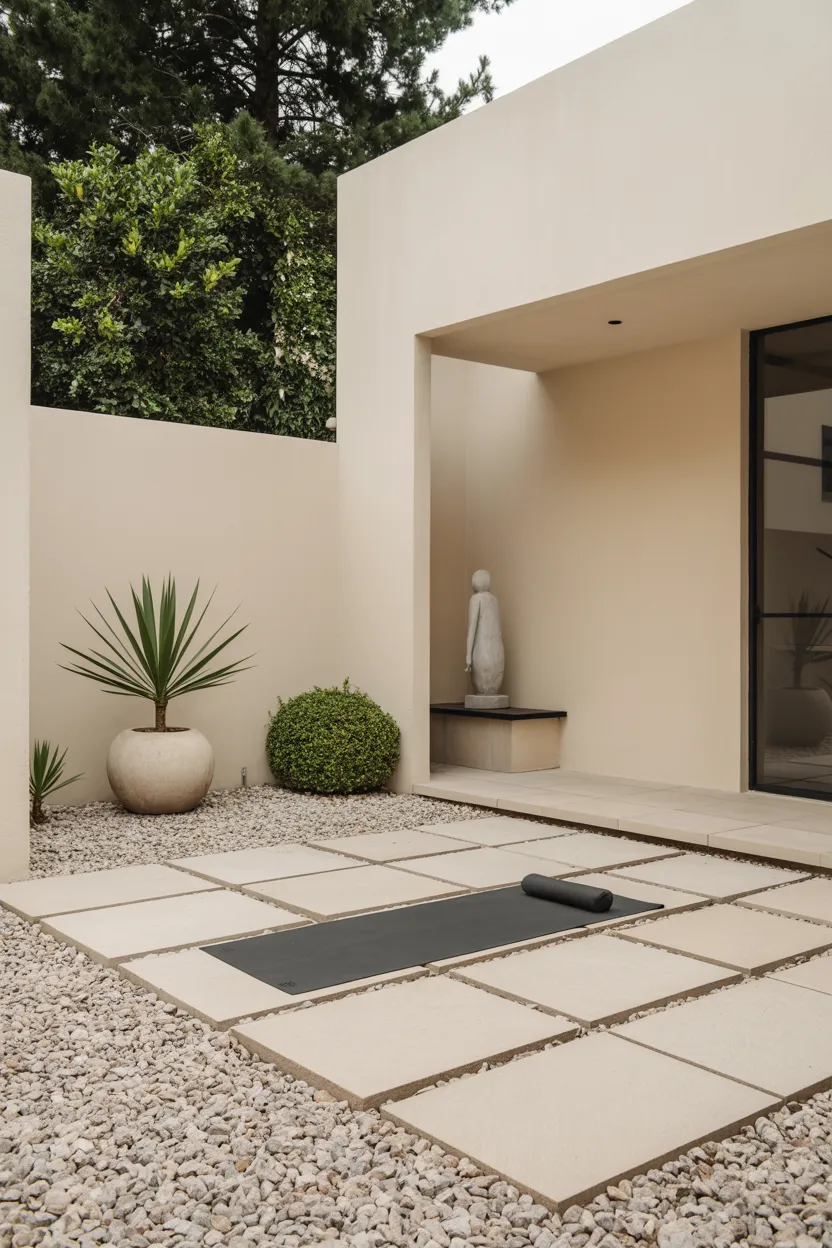Gravel and pavers create one of the cleanest outdoor yoga setups you can make. They look simple, they drain well, and they give the whole area a quiet Zen-style feel. If you like minimalist landscapes, this setup makes a lot of sense.