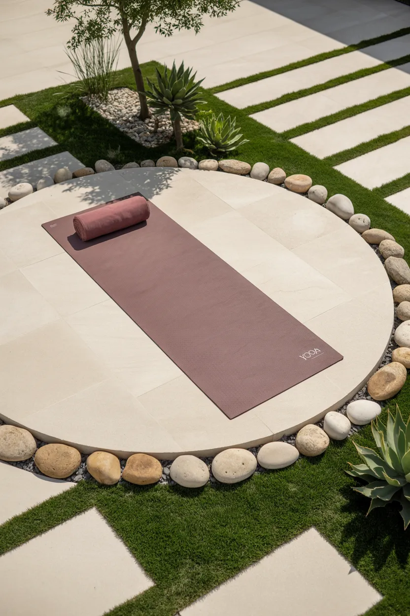 Natural stone borders help define your yoga area in a subtle but effective way. They create a clear edge, which makes the space feel designed and intentional without needing a wall or fence.