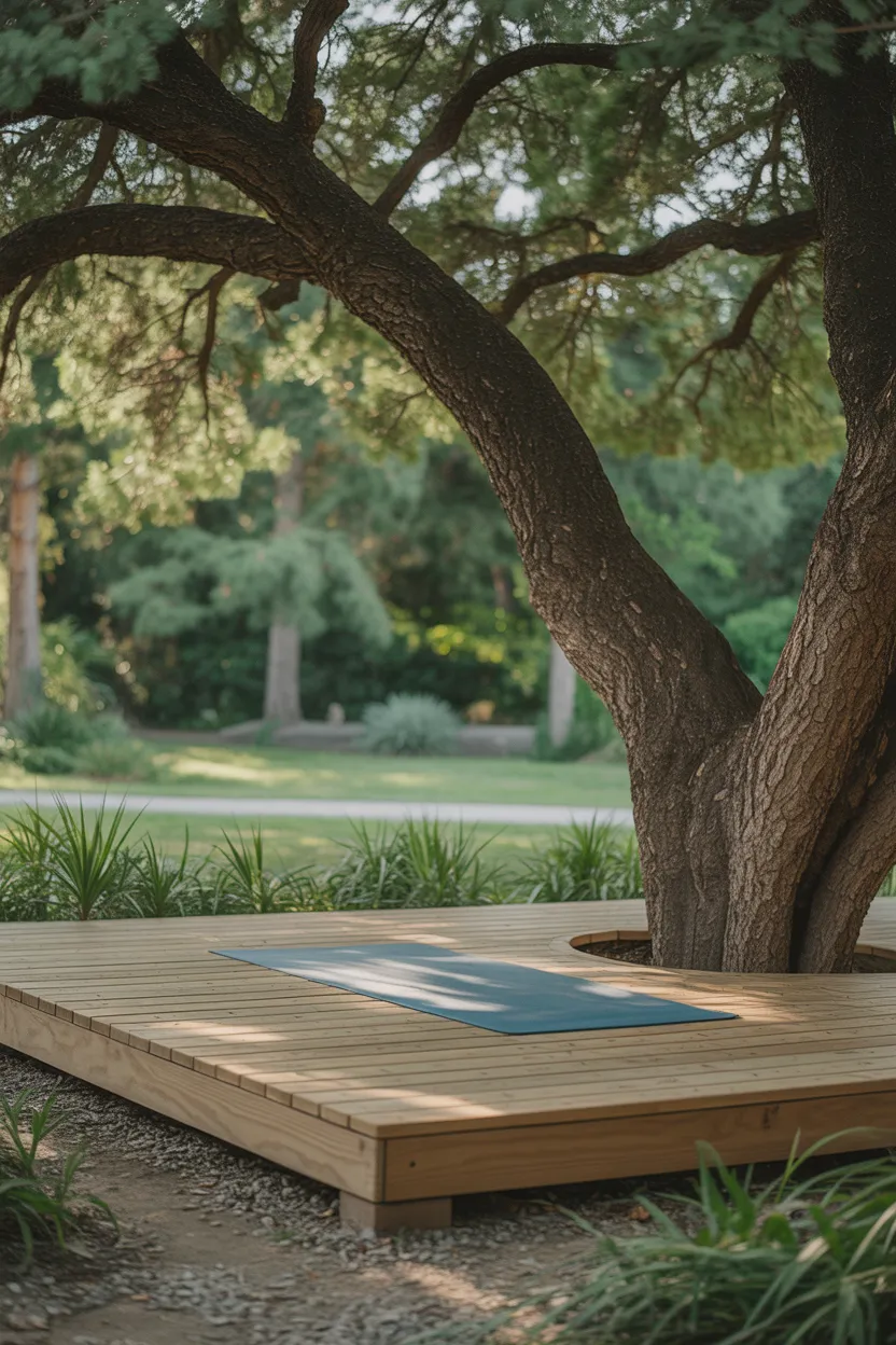 A tree-shaded yoga platform feels calm in a way that is hard to fake. The shade looks natural, the light shifts beautifully through the leaves, and the whole space feels cooler and more relaxed from the start.