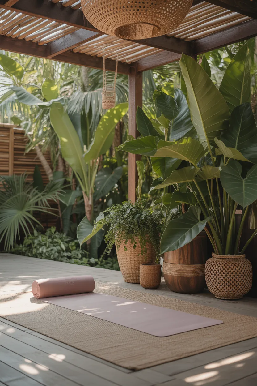 If you want your yoga space to feel lush and immersive, a tropical-inspired setup can look amazing. Layered greenery, warm wood, and soft filtered light can make even a basic corner feel like a mini retreat.