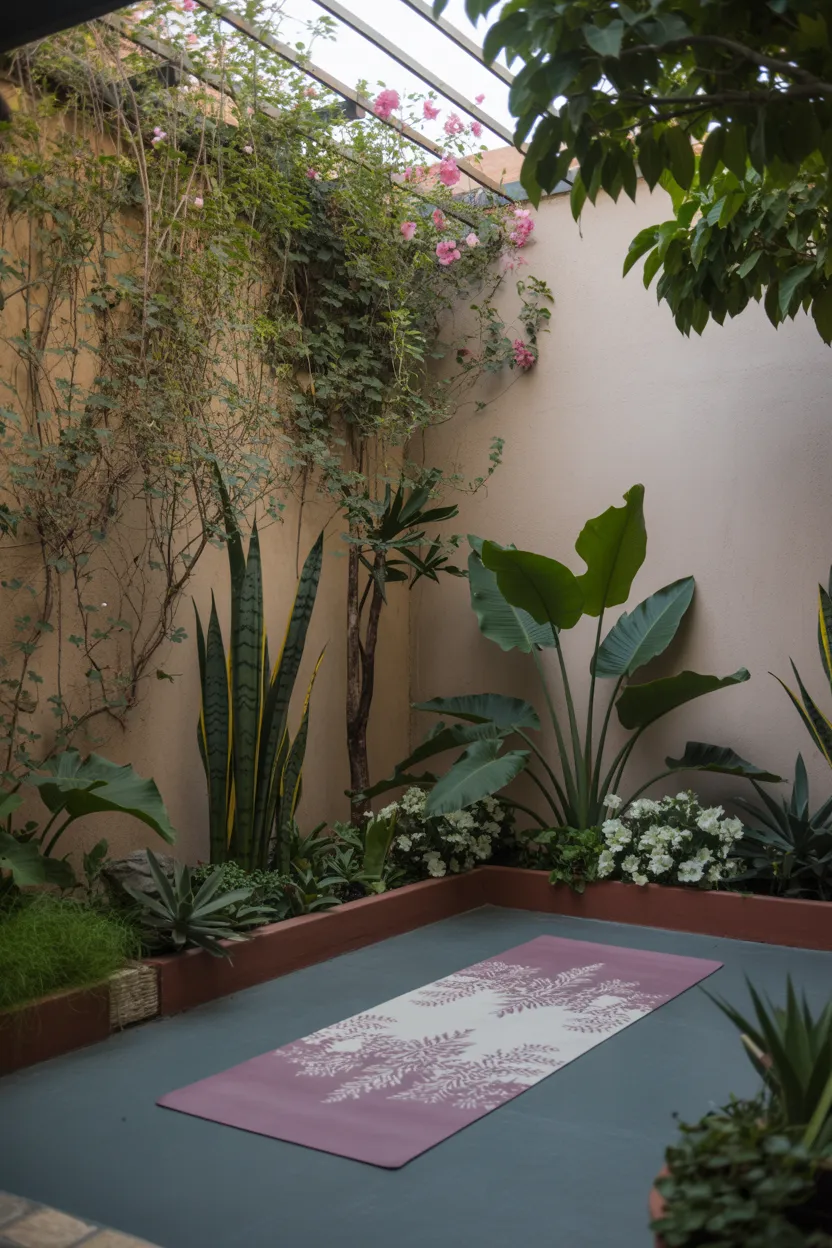 A tucked-away garden corner can feel incredibly peaceful. If you already have a fence line, hedges, shrubs, or flowering plants, you can use that natural privacy to create a little yoga retreat without building much at all.