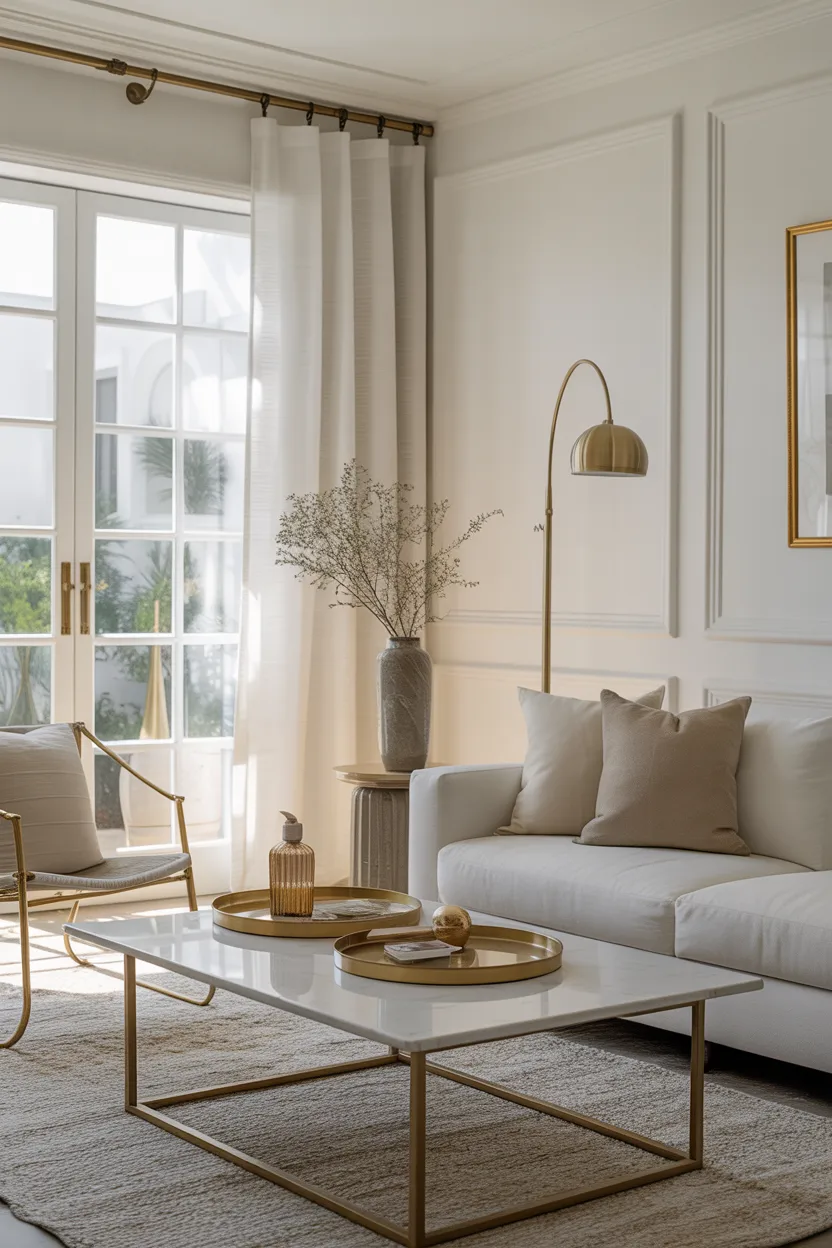 White and gold is one of those combinations that looks like it costs significantly more than it actually does, and that is genuinely one of its best qualities. Brushed brass or aged gold accents add warmth and elegance to a white living room without overpowering the brightness or pulling the eye away from the overall palette. Light fixtures, curtain rods, picture frames, decorative objects, and cabinet hardware all represent opportunities to introduce this warm metallic tone throughout the space.