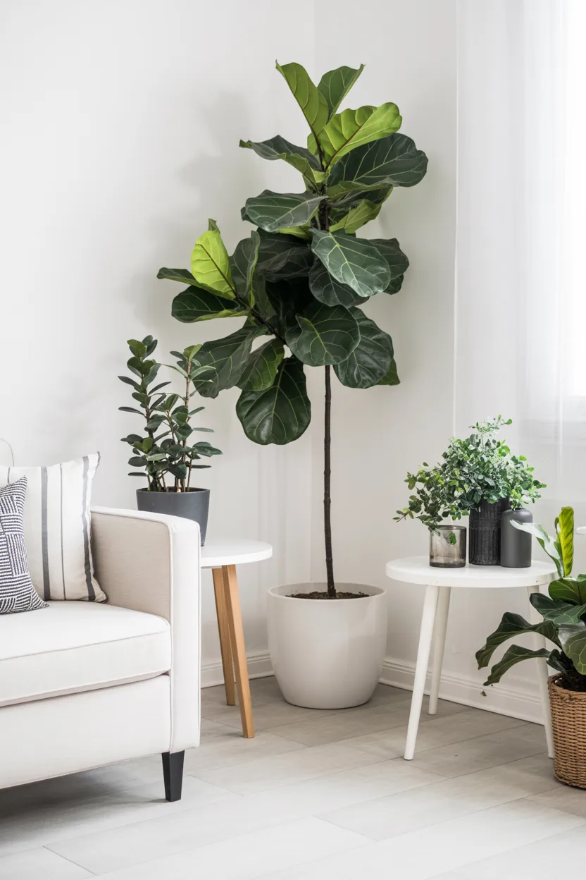 Plants in a white living room do something genuinely special because the contrast between fresh green and clean white is one of the most visually satisfying combinations in any interior space regardless of style or budget. Large leafy plants like fiddle leaf figs, monsteras, or olive trees add life, color, and organic movement to a white room without pulling it away from its elegant simplicity or compromising the brightness.