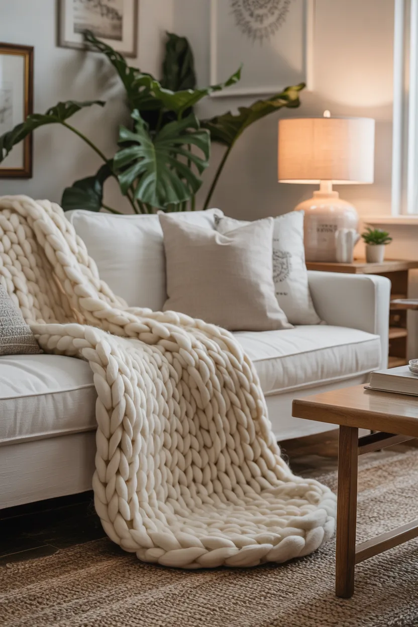 The texture of a chunky knit catches light and creates gentle shadows across its surface that add dimension to an otherwise smooth, flat sofa. It also signals to anyone who enters the room that the space is actually meant to be used and enjoyed rather than admired carefully from a safe distance 🙂 That feeling of warmth and approachability is exactly what the best white living rooms communicate to everyone who spends time in them.