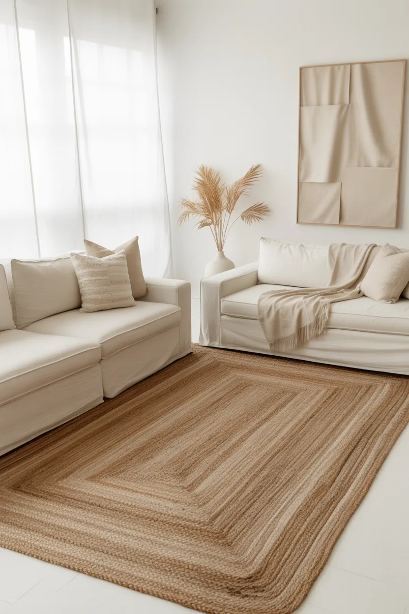 Ever wondered what ties a white living room together and stops it from feeling like separate floating pieces of furniture? A natural fiber rug does that job better than almost anything else. Jute, sisal, and seagrass rugs in their natural warm beige tones work beautifully against white floors and white furniture because they add texture and warmth simultaneously without introducing any color that fights with the overall palette.