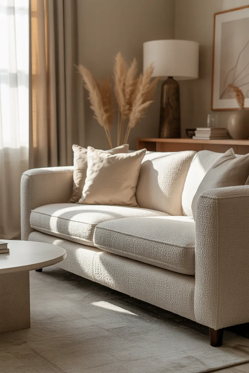Your sofa anchors the entire living room, and in a white space, a textured white or cream sofa becomes the centerpiece that holds everything together. Bouclé fabric sofas have dominated the conversation heading into 2026 for very good reason. The looped texture catches light beautifully and adds a tactile richness that flat fabric simply cannot replicate, making the sofa feel like a genuine design statement rather than just a place to sit.