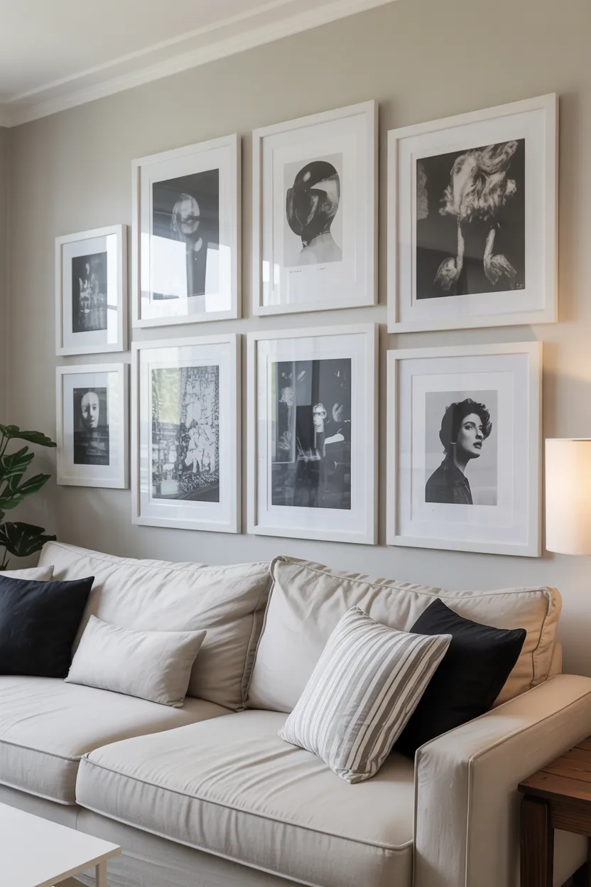 A gallery wall in a white living room sounds like it might disappear entirely into the wall, but done correctly it creates an incredibly sophisticated and considered moment. Use white or off-white frames in varying sizes and fill them with black and white photography, simple line drawings, or abstract prints with minimal color. The frames blend softly with the wall while the artwork inside provides all the visual interest and personality.