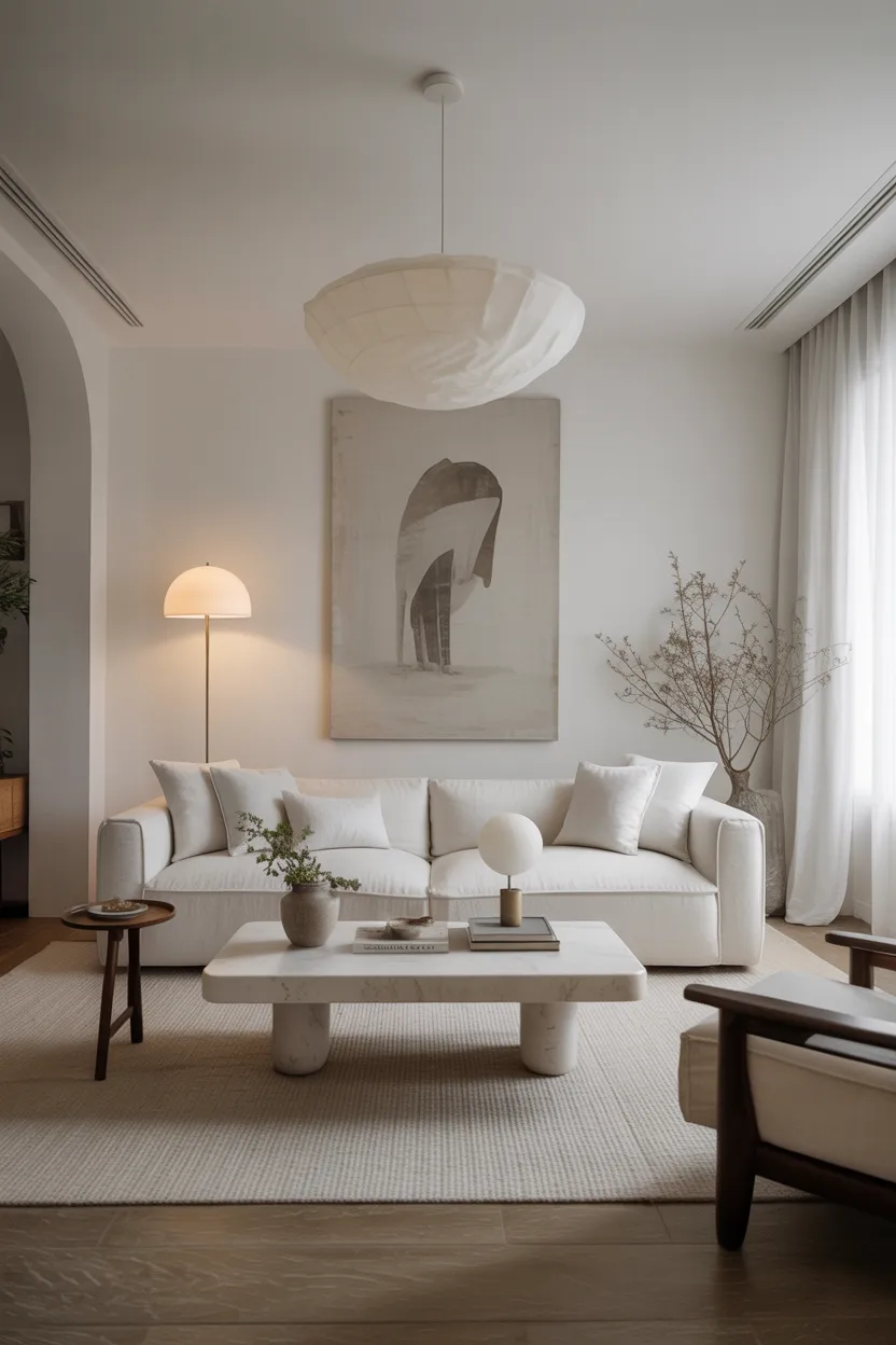 The ceiling light in a white living room gets to be a genuine statement piece rather than a background afterthought because the white backdrop allows the fixture itself to take complete center stage. A sculptural pendant light, an oversized rattan chandelier, or a plaster ceiling light all work beautifully in a white living room and immediately become a conversation point that anchors the visual identity of the entire space from above.