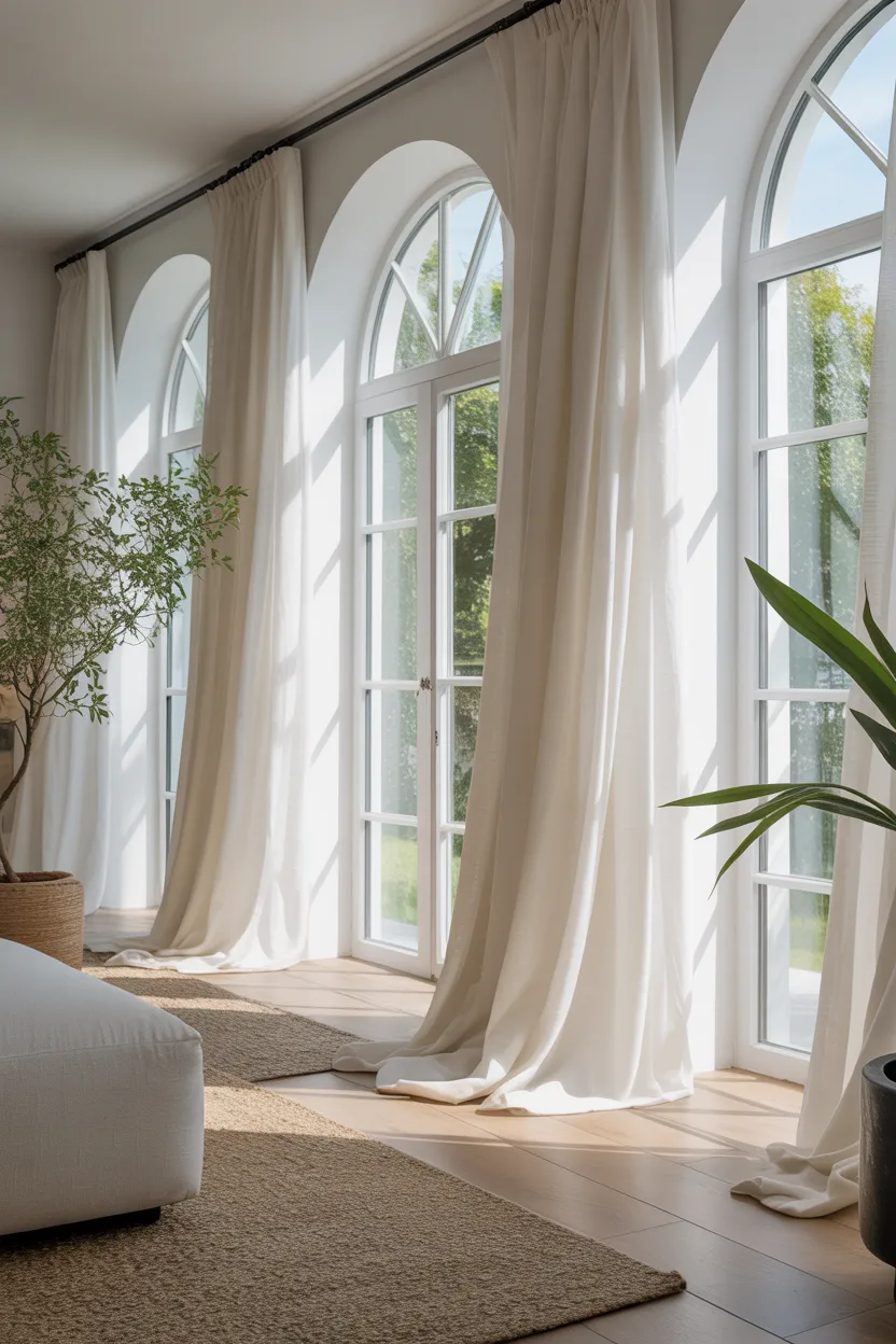 Curtains in a white living room carry enormous visual weight, and floor-to-ceiling white linen curtains are one of the highest-impact changes you can make to the overall elegance of the space. Hang them high above the window frame and extend the rod well beyond the window edges on both sides. This makes your windows look dramatically larger and your ceilings feel significantly taller, which changes the entire energy of the room in the best possible way.