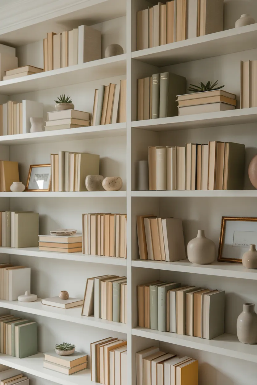 Intersperse books with simple decorative objects, small plants, and sculptural pieces that fit within the neutral palette. Remove anything from the shelves that introduces a jarring color or that looks like it landed there entirely by accident without any thought. A well-curated white bookshelf in a white living room looks like a deliberate design feature rather than storage, and that distinction matters enormously for the overall elegance and coherence of the space.