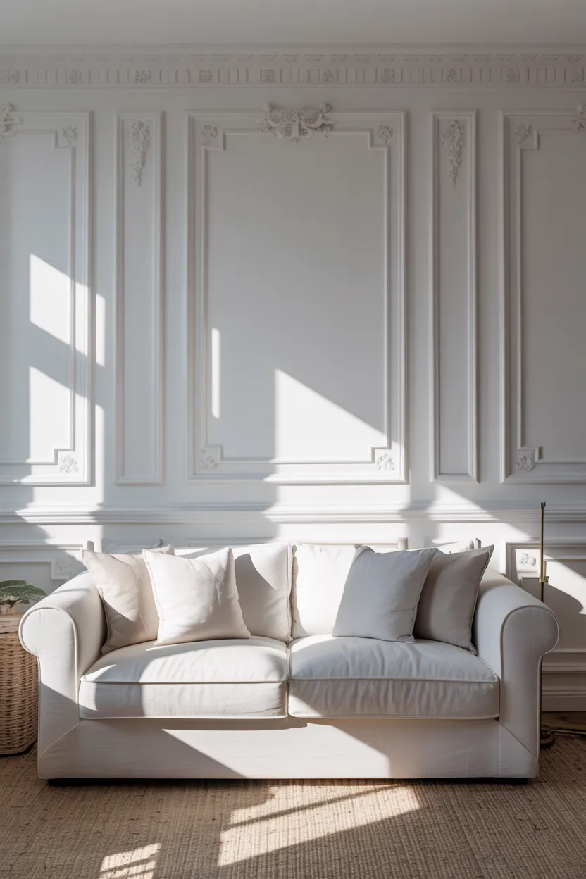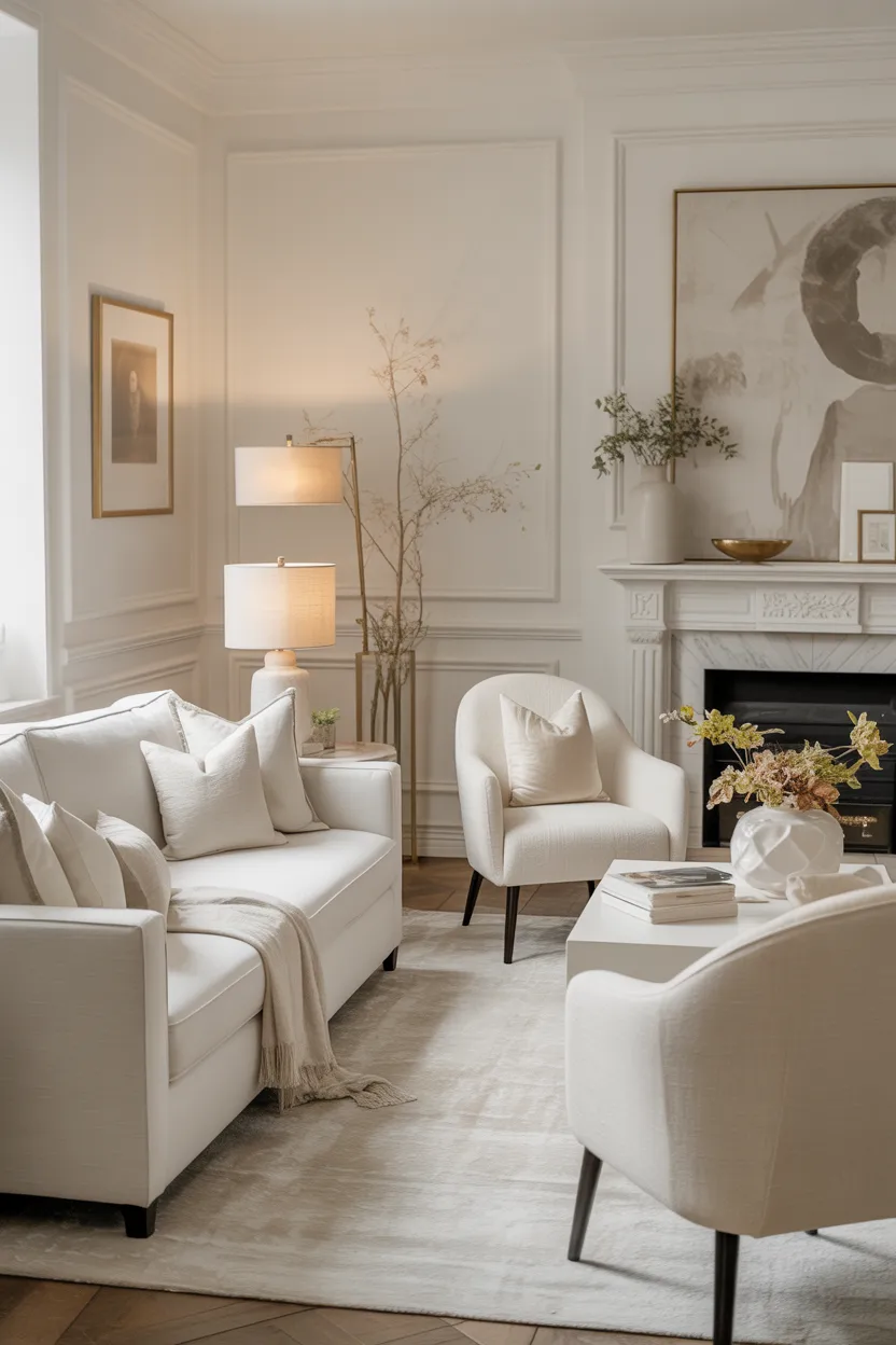 White living rooms benefit enormously from architectural details because molding, ceiling roses, wainscoting, and paneling all create shadow and dimension that adds elegance and character without introducing color. When everything is painted the same warm white, these architectural elements read as textural and structural features rather than color contrasts, and the effect is quietly stunning in a way that grows more impressive the longer you spend time in the space.