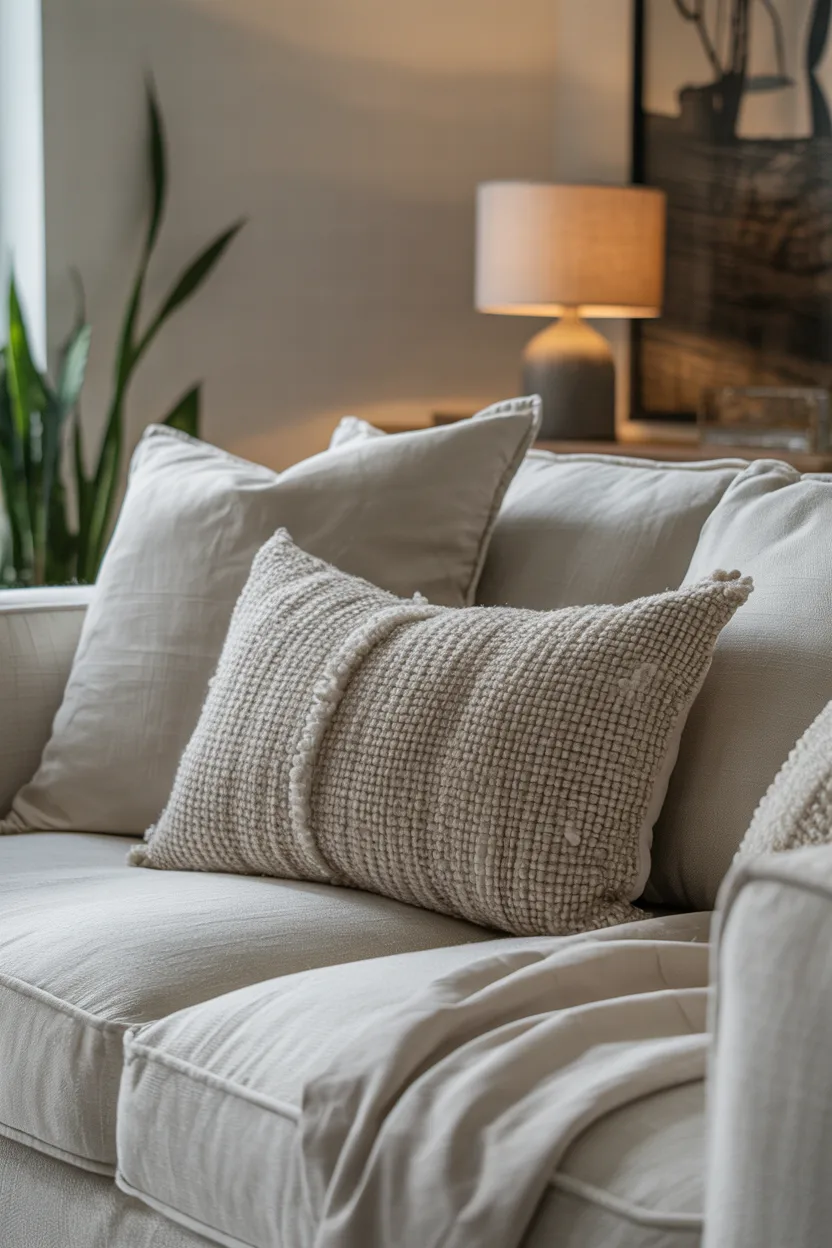 Vary the sizes and shapes across your pillow arrangement too. Square pillows, rectangular lumbar pillows, and round bolster pillows used together create a layered arrangement that looks incredibly considered and genuinely comfortable at the same time. The textural variety keeps the eye engaged and moving across the sofa without introducing anything that disrupts the bright and elegant aesthetic of the overall room you have worked so hard to create.