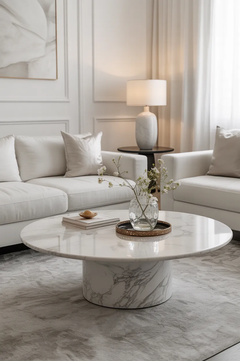 Marble and white living rooms belong together in a way that feels almost obvious once you see it done well. White marble with soft gray veining adds elegance and visual interest without introducing any color that disrupts the bright, clean palette. A marble coffee table, fireplace surround, or side table surface elevates the entire room instantly and adds a sense of luxury that is genuinely hard to replicate with any other material.