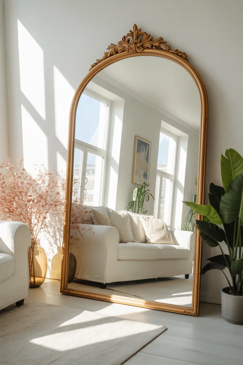 Choose a mirror with a frame that fits your overall aesthetic because the frame matters as much as the mirror itself. Warm wood, aged brass, or a simple plaster-finish frame all work beautifully in a white living space. Position the mirror opposite or adjacent to your main window for maximum light reflection and size up generously because a mirror that is too small in a white room barely registers and misses the entire point of the exercise.