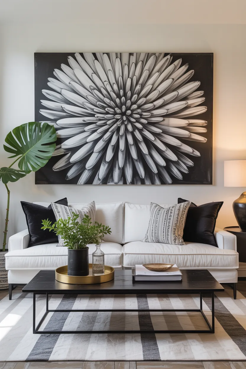 Large-scale artwork in this monochromatic approach becomes a genuinely bold statement rather than a small decorative detail that gets lost against the wall. A single oversized black and white photograph or abstract canvas positioned above the sofa anchors the entire seating arrangement and gives the room a gallery-like quality that feels sophisticated and intentional without requiring any additional decoration around it.