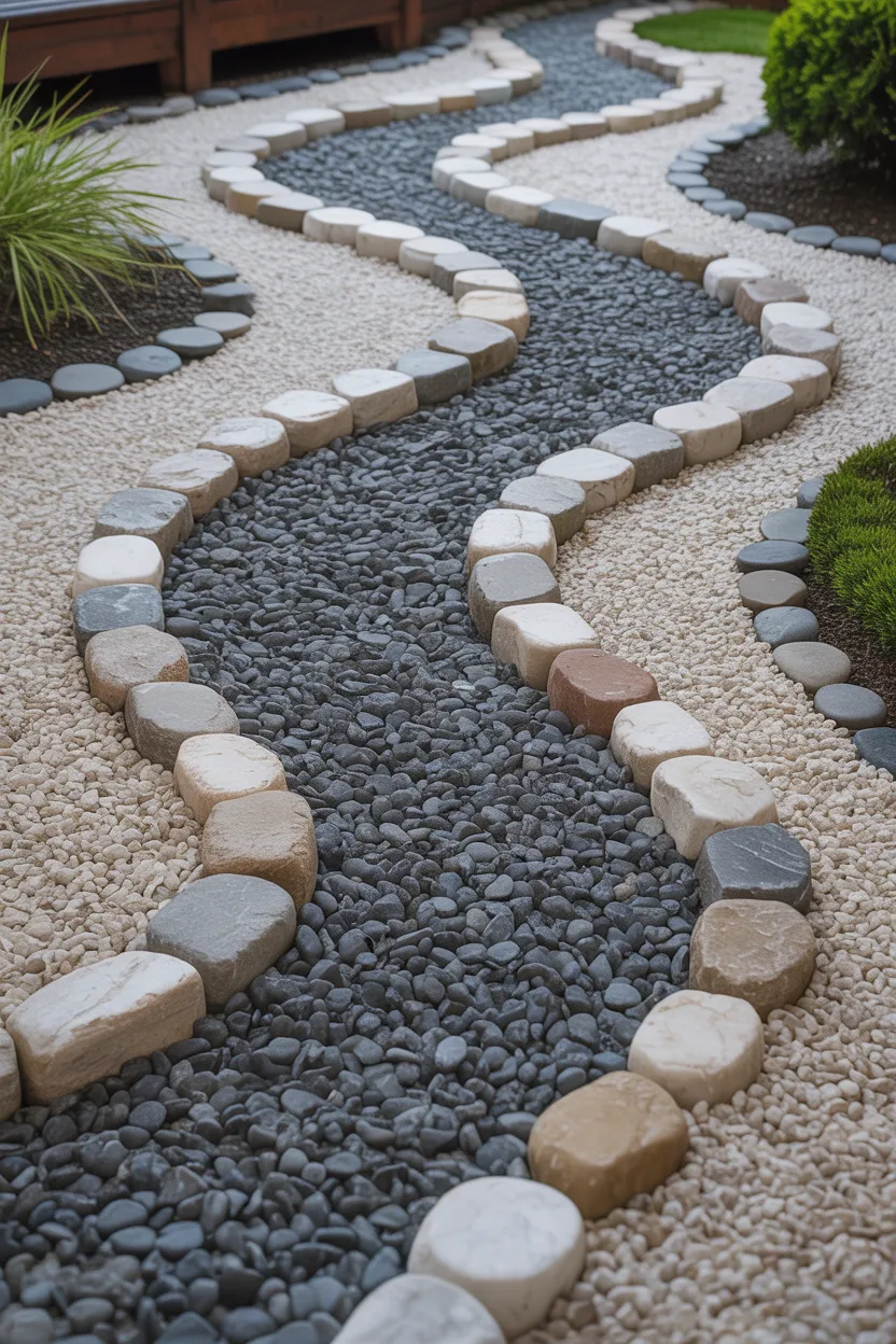 Use curved bands of gravel or small stones to represent the stream, then edge it with larger rocks to define the shape. You can make it narrow and subtle or let it wind more dramatically through the space depending on the size of your yard.