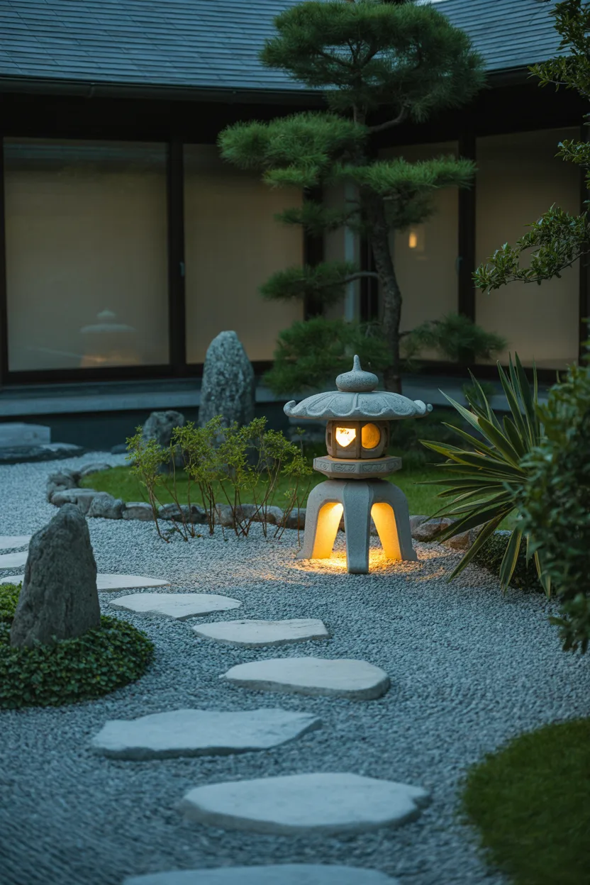 Lanterns give a zen garden a quiet glow after sunset and make the space feel inviting at night. That soft lighting adds mood without overpowering the design. Bright floodlights ruin the whole vibe fast, so subtle lighting matters here.