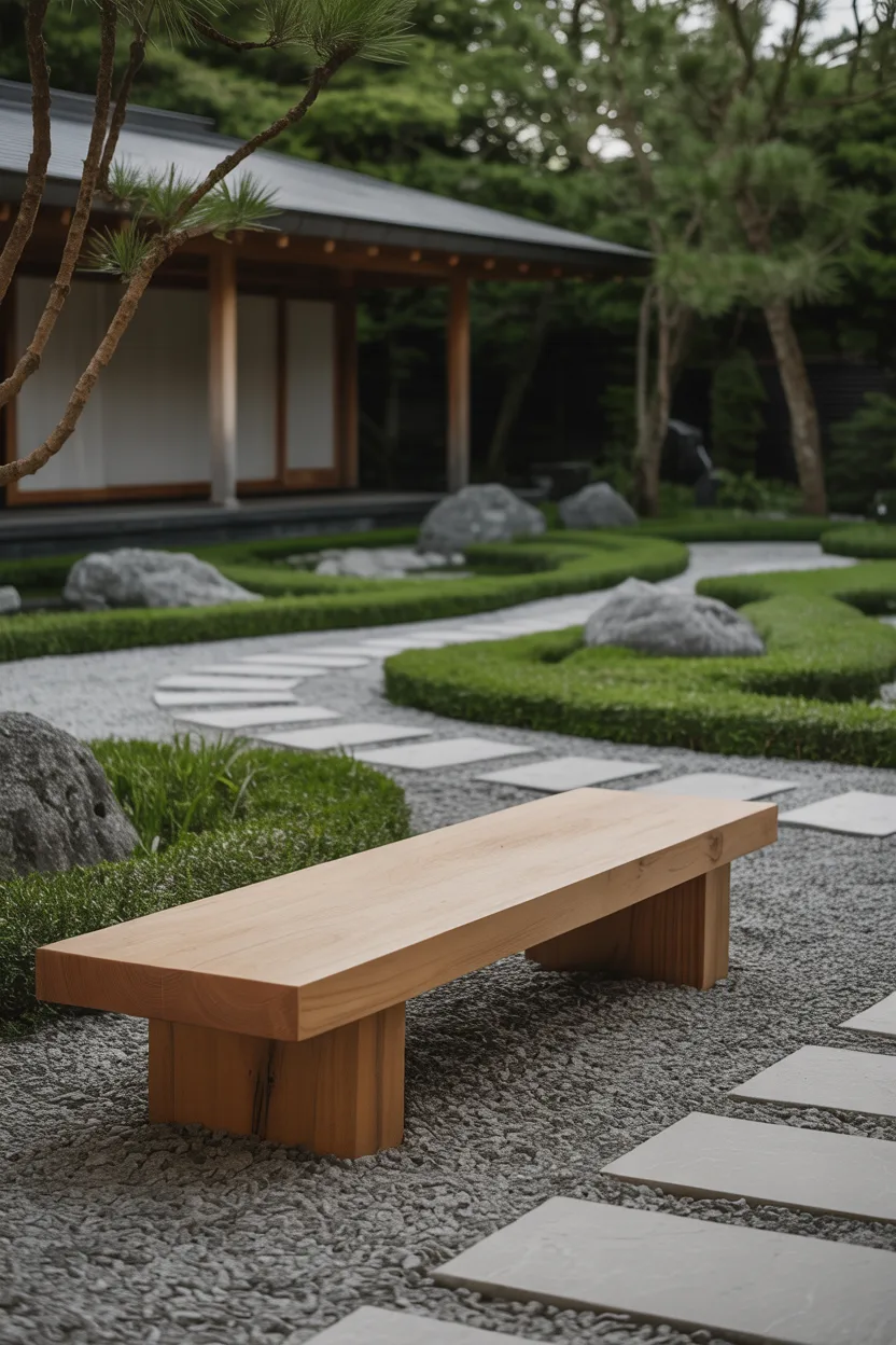 A zen garden should not just look peaceful. It should give you a reason to stop and enjoy it. A low wooden bench does exactly that. It adds function, warmth, and a simple place to sit without interrupting the calm design.