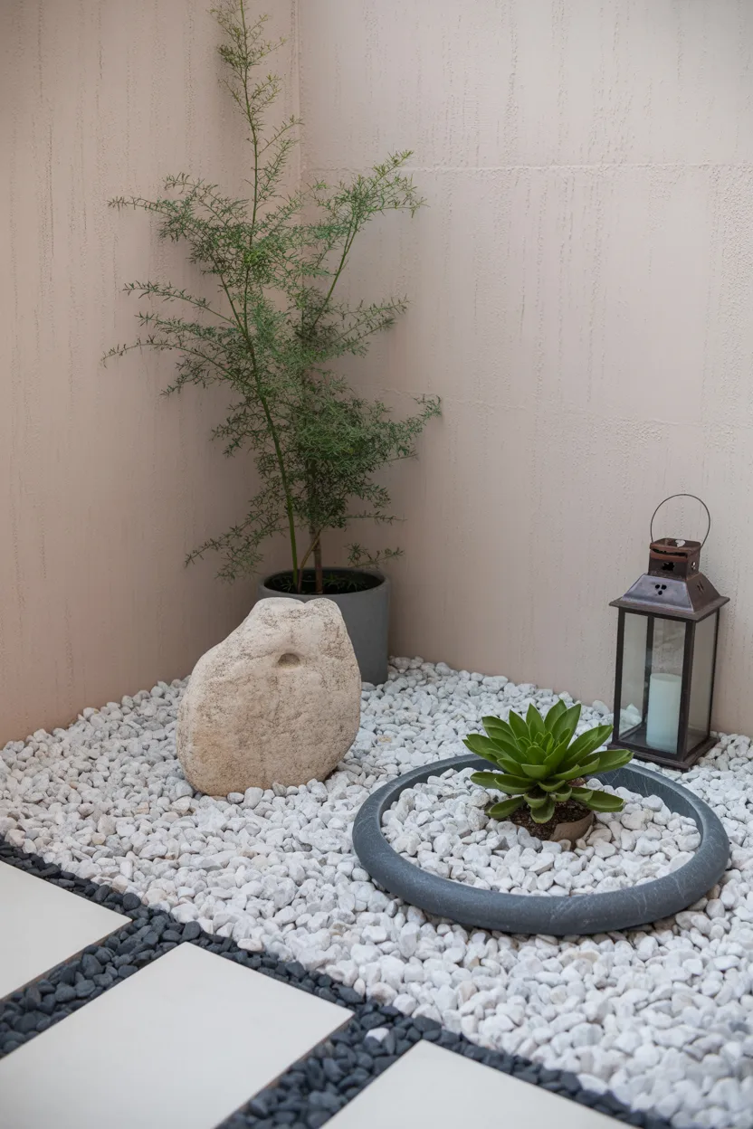 Start with a compact gravel section, then add one or two stones, a small plant, and maybe a lantern or low feature. That is enough to create atmosphere without crowding the space. The key is resisting the urge to keep adding things.