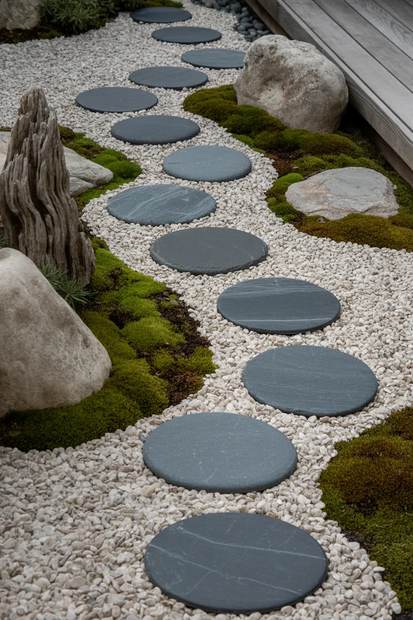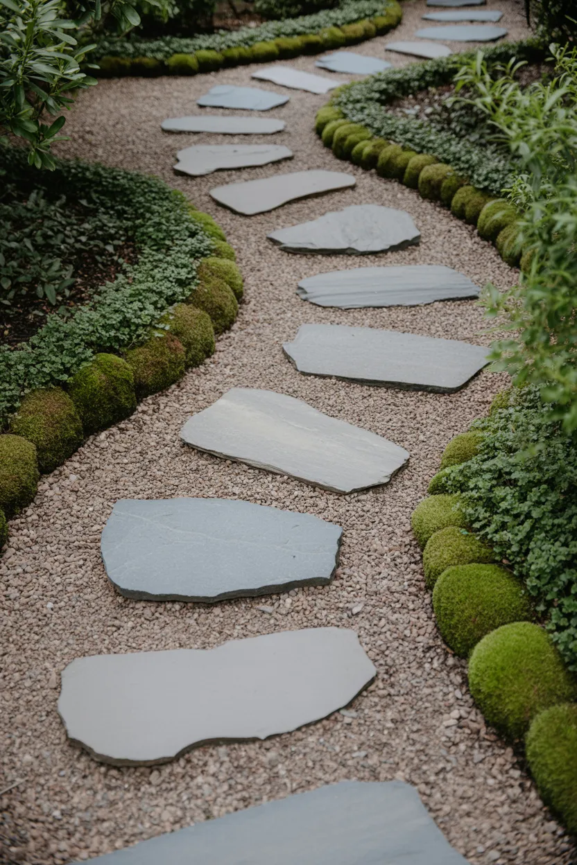 Use flat stepping stones with some space between them to create a relaxed walking rhythm. You do not want the path to feel too formal. A slightly uneven placement often looks more natural and more peaceful.