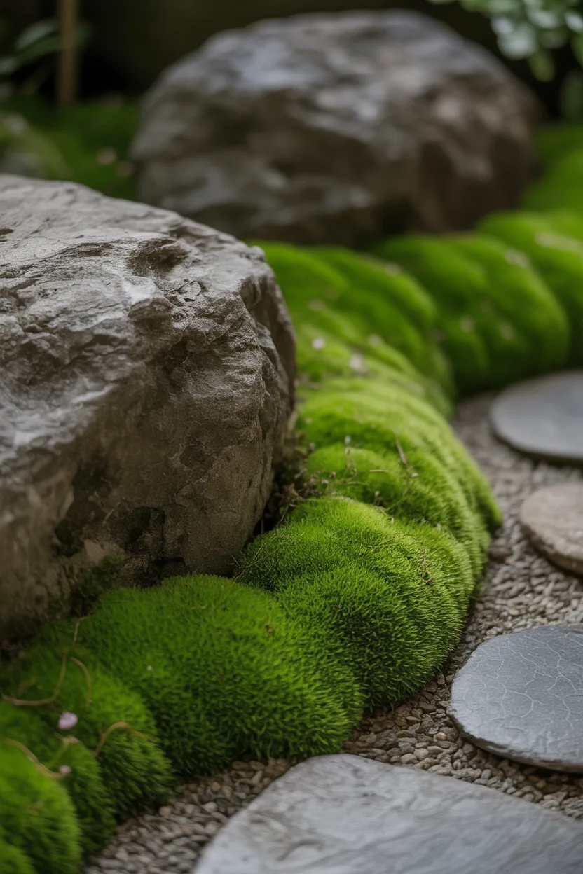 Use moss around rocks, between stepping stones, or in shaded corners where it can thrive. Its rich green color helps break up the neutral tones of the gravel without feeling bright or distracting. That subtle contrast works really well in zen spaces.