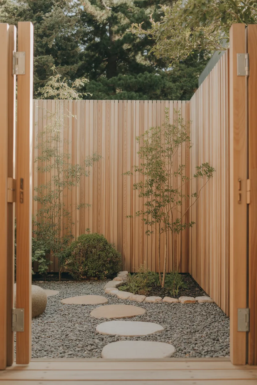 Natural wood fencing helps define the zen garden and adds warmth at the same time. It creates privacy and a sense of enclosure, which makes the whole space feel more restful. That calm backdrop also helps the rocks, gravel, and plants stand out more clearly.