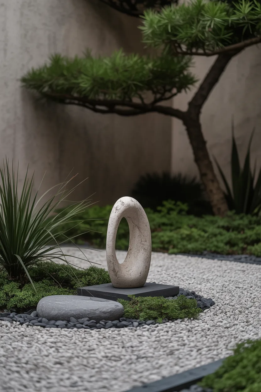 Choose a sculpture in stone, ceramic, or weathered metal with a simple shape and natural finish. Organic forms usually work best because they feel softer and more connected to the landscape. Avoid anything too ornate or dramatic.