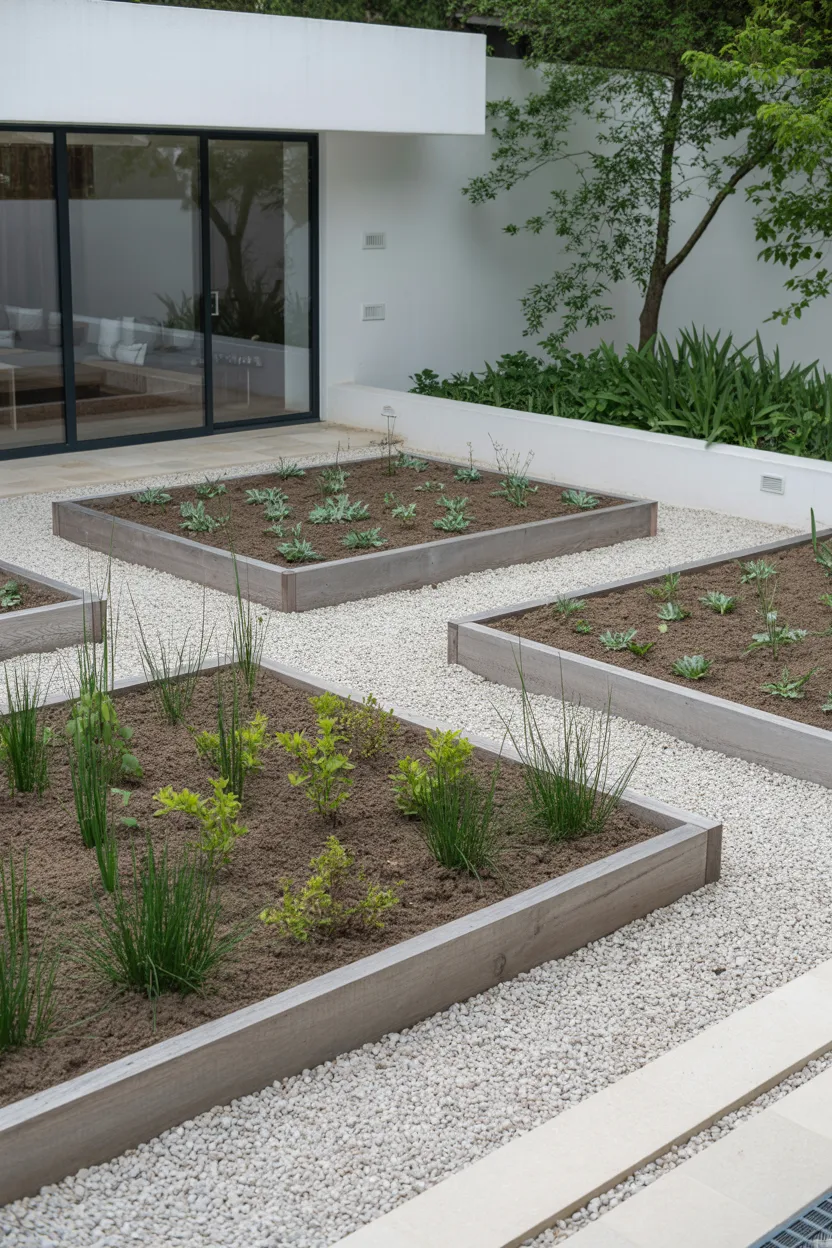 Use wood, concrete, or stone raised beds with simple shapes and neutral finishes. Keep the planting minimal so the beds do not feel too busy. Pair them with gravel paths, sculptural rocks, or a single focal tree for balance.