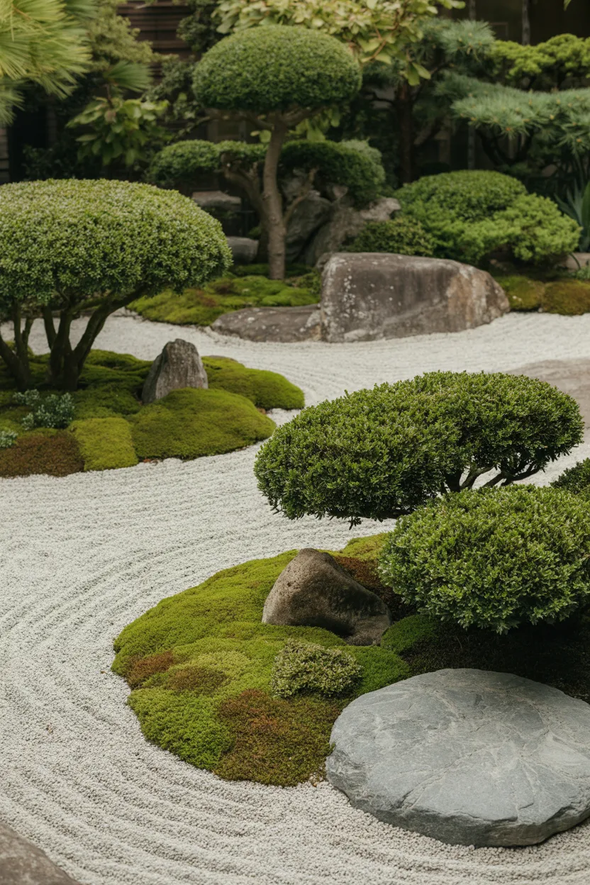 Pruned shrubs bring shape and order to a zen garden. They add greenery while keeping the look controlled and elegant. Rounded or cloud like forms work especially well because they soften the harder lines of stone and gravel.