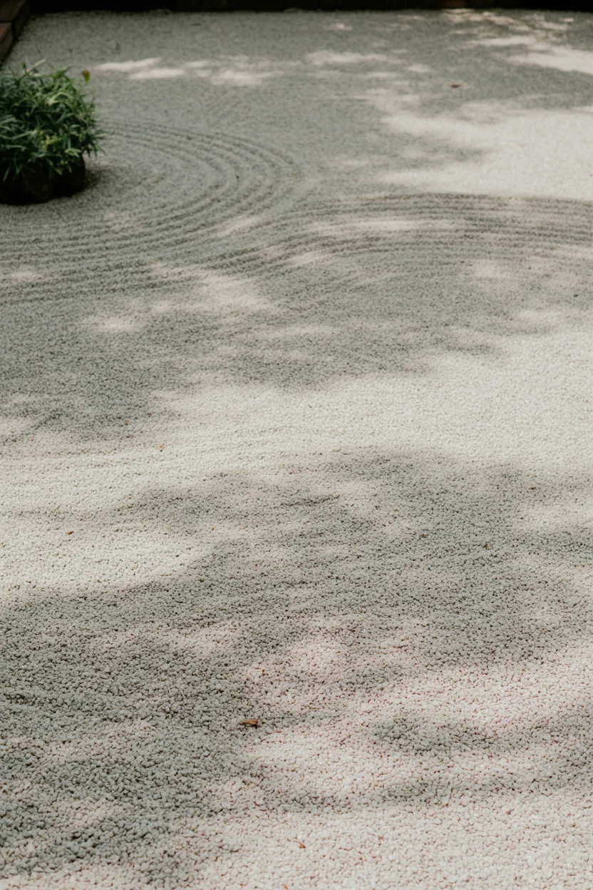 Use a wide rake to draw gentle lines through the gravel or sand. You can keep the pattern simple or make it a little more detailed around stones and focal points. The goal is not perfection. The goal is rhythm and calm.